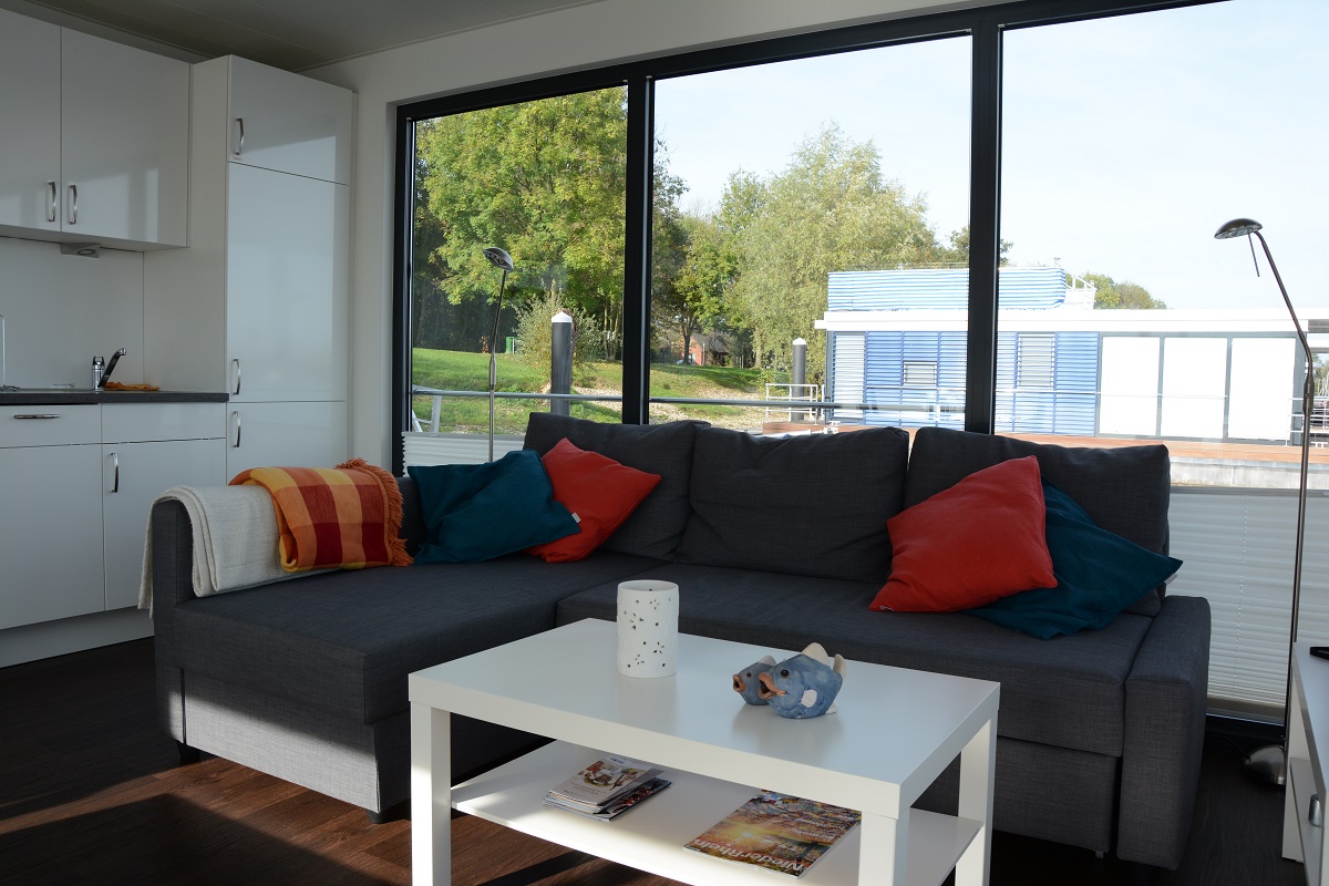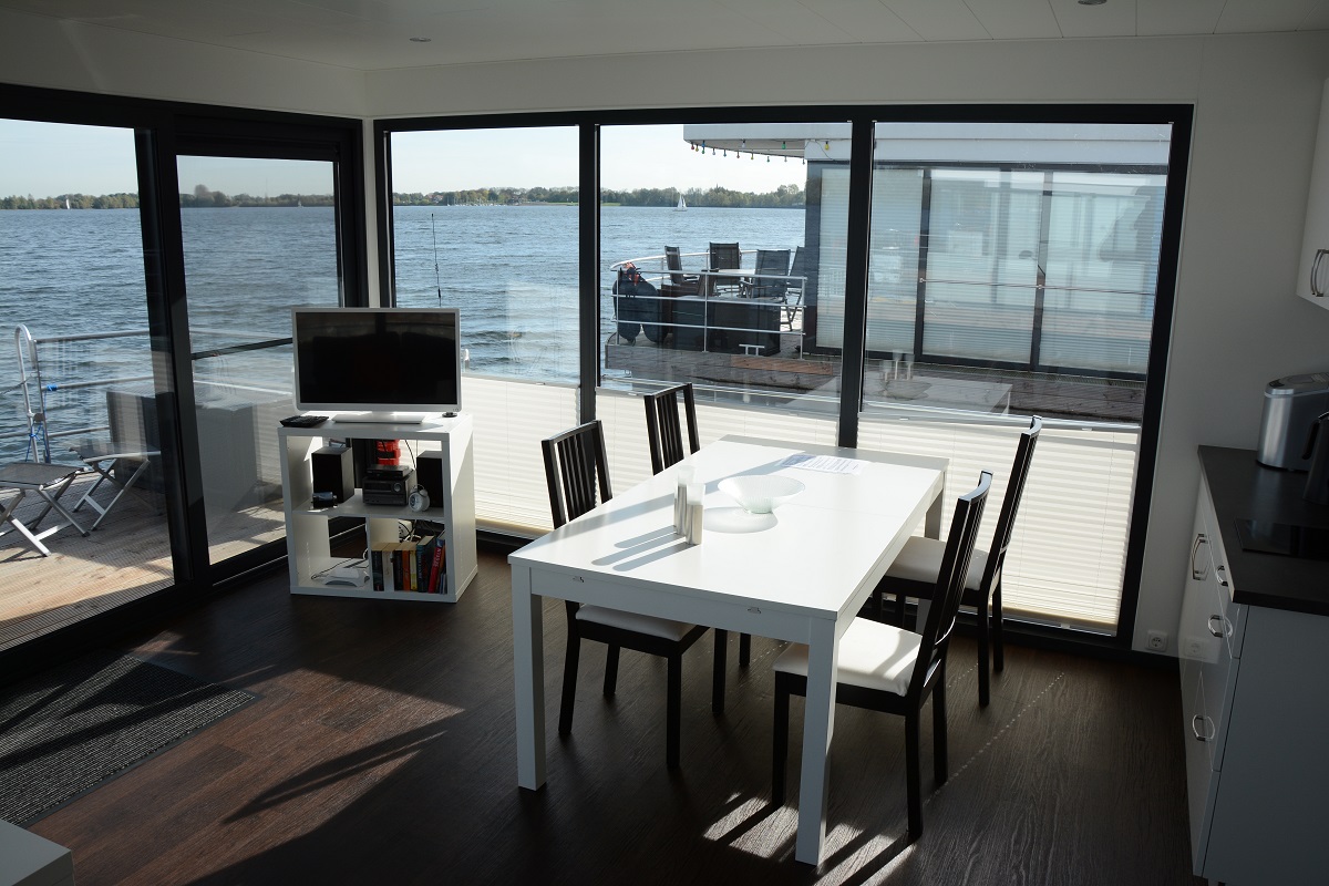 Ein Wintergarten auf dem Wasser ? Sie verfügen über einen großen rundum verglasten Wohn-Essraum mit gemütlicher Sofaecke, großem Esstisch für 6 Personen, großem Flachbildfernseher, einer Küchenzeile mit Cerankochfeld und reichlich vorhandenen Utensilien. |