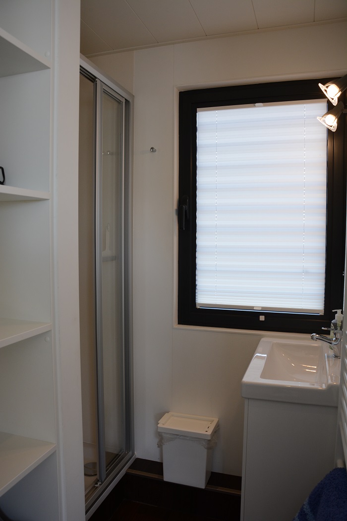 Das Duschzimmer Auf dem Hausboot stehen Dusche und WC in getrennten Räumen zur Verfügung. Das Duschzimmer hat zusätzlich zur Dusche noch ein Waschbecken mit einem darüber angebrachten Spiegel und wird mit einem Handtuchheizkörper beheizt. Im Regal ist Platz für persönliche Dinge und zusätzlich steht ein Fön zur Verfügung. |