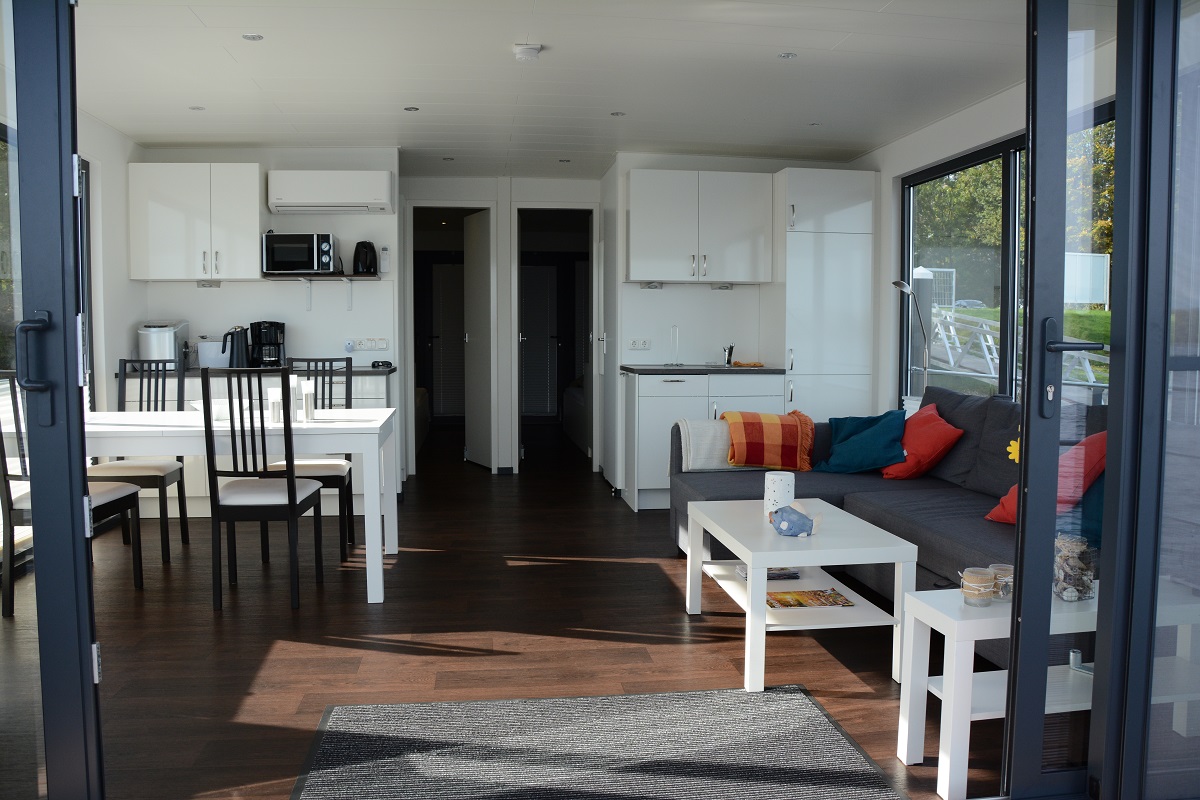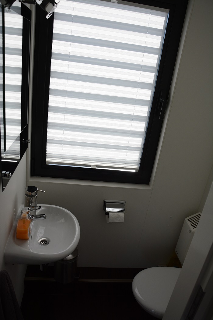 Die Schlafzimmer In den beiden, spiegelverkehr angeordneten Schlafzimmern stehen zwei gemütliche Doppelbetten (160cmx200cm) mit getrennten Lattenrosten und hochwertigen Matratzen für einen erholsamen Schlaf zur Verfügung Je nach Vorlieben öffnet man Nachts die seitlichen Fenster (links im Bild) oder stellt die vorderen Eingangstüren angeklappt auf. Vor allen geöffneten Fenstern sorgt ein Mückenschutzgitter für eine ungestörte Nachtruhe. Die Schlafzimmer sind mit LED-Deckenleuchten sowie mit den hinter den Betten angebrachten Leselampen ausgestattet. Dahinter befindet sich in jedem Schlafzimmer ein nach oben öffnender Klappschrank, sowie ein hoher Schrank für Kleidung. Links in der Ecke ( auf dem Bild nicht zu erkennen ) steht in jedem Schlafzimmer ein weiterer Esstischstuhl, der bei Bedarf ins Wohnzimmer geholt werden kann. |