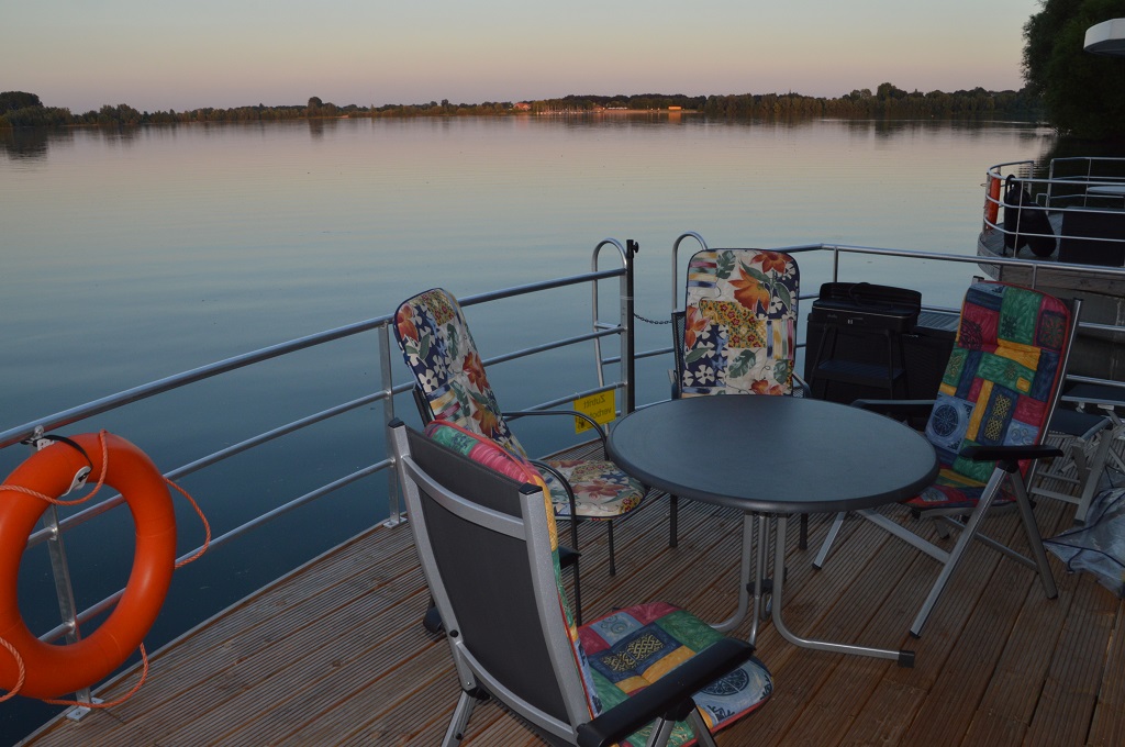 Die Bugterrasse Unser Hausboot verfügt über zwei Terrassen. Eine ist vorne im Bug und ermöglicht eine gemütliches Sitzen für 8 bis 10 Personen. Hier sitzen Sie direkt am Wasser und sonnen- und wettergeschützt unter einem vorspringenden Dach. Ebenso sitzen Sie auf der Terrasse gut geschützt vor Wind und Wetter an den schlechteren Tagen. |