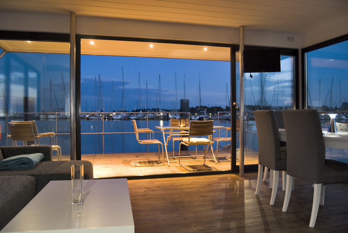 A winter garten on the water ? You have a large all around glazed living room with comfortable sofas, a big dining table for 6 persons, a big flat screen TV, a kitchenette with an induction stove and a lot of equipment. |
